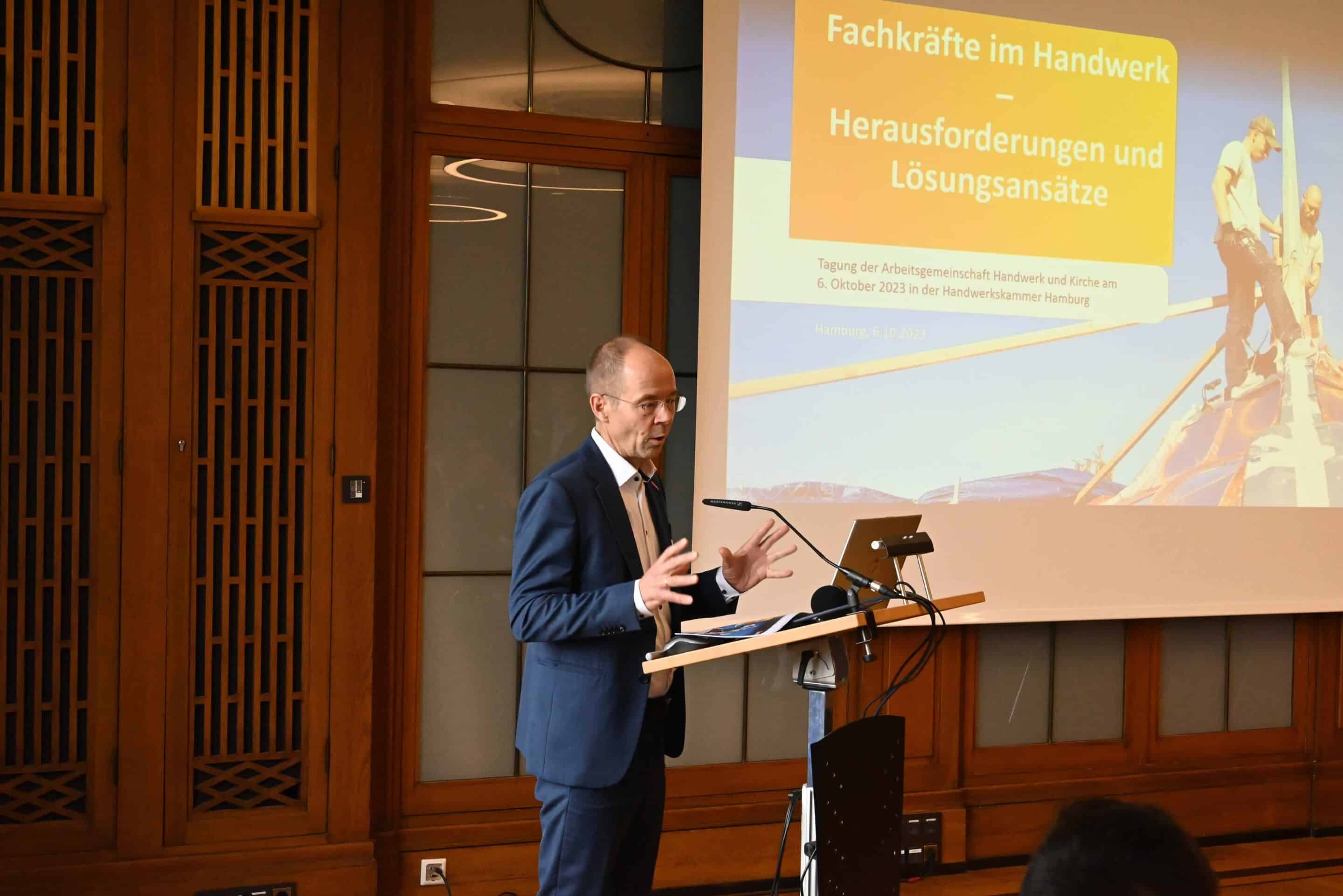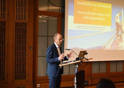 Thema der Tagung war der Fachkräftemangel – ein drängendes Problem, das Handwerk und viele andere Bereiche in der Arbeitswelt herausfordert. Beim gut besuchten Fachtag – zum Auftakt in der ehrwürdigen Handwerkskammer Hamburg – präsentierten zwei Keynote-Speaker aktuelle Informationen, Trends und Fakten.