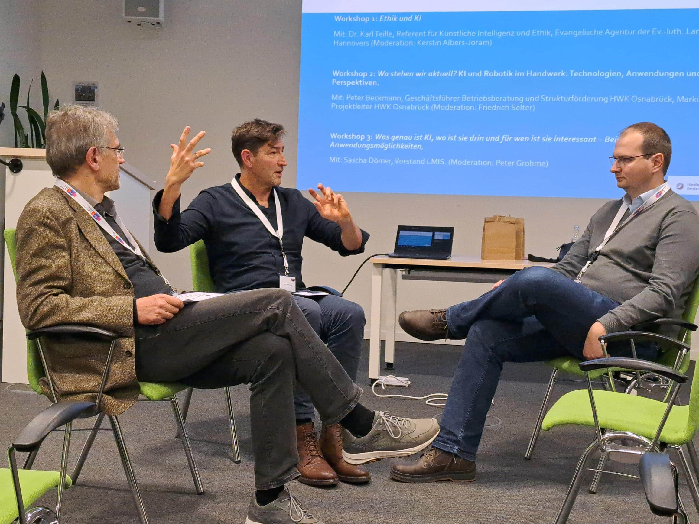 In den anschließenden Arbeitsgruppen wurde das Thema aus unterschiedlichen Perspektiven beleuchtet – von ethischen Fragen (Dr. Karl Teille) über technische Entwicklungen und Anwendungen im Handwerk (Peter Beckmann, Markus Kybart) bis hin zu konkreten Einsatzmöglichkeiten von KI in Betrieben (Sascha Dömer, LMIS AG).