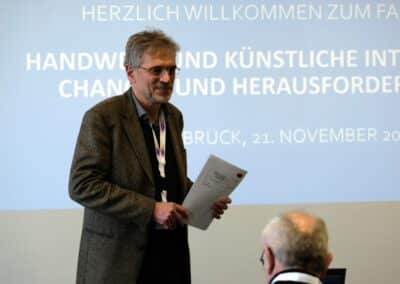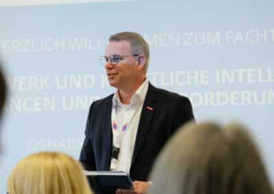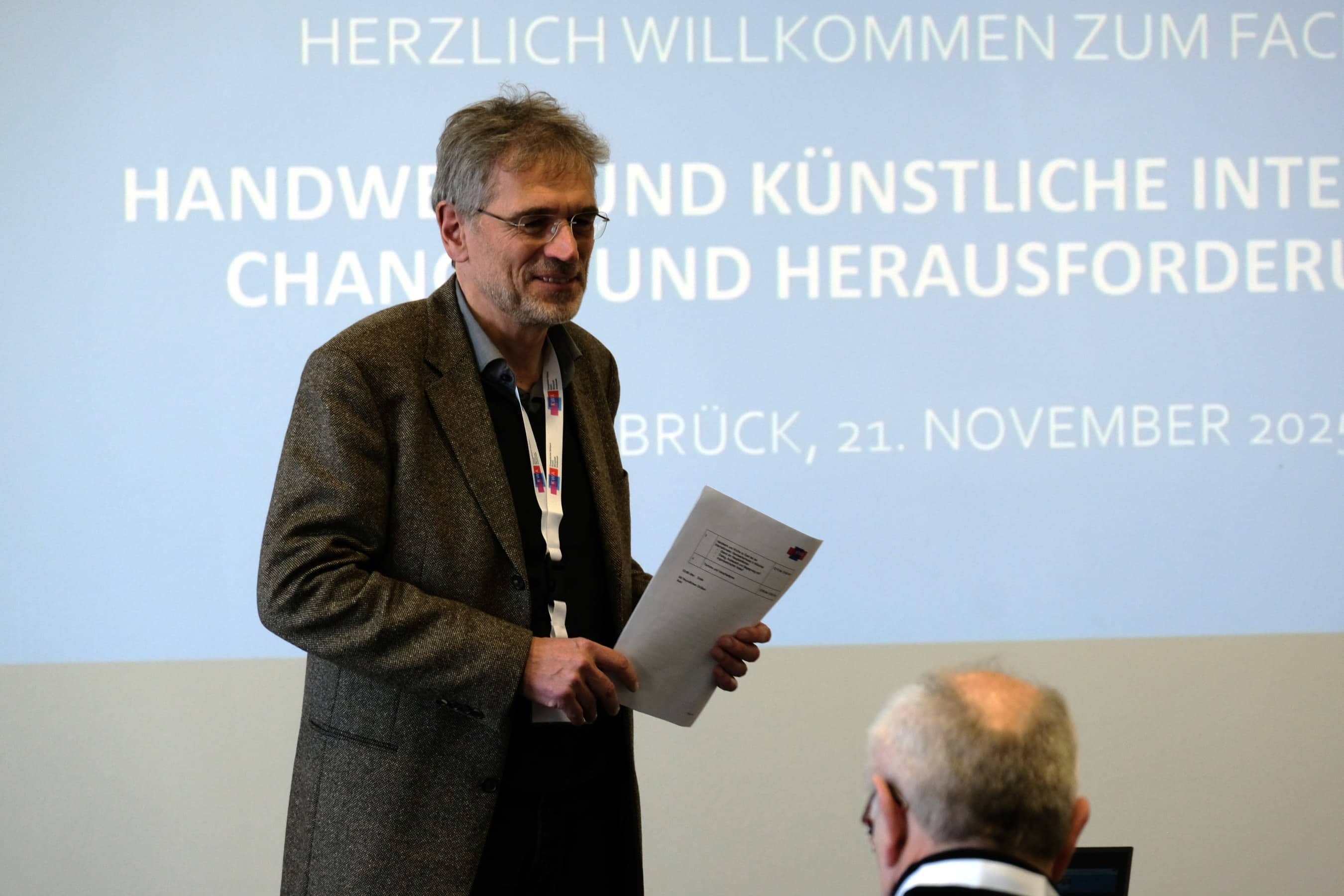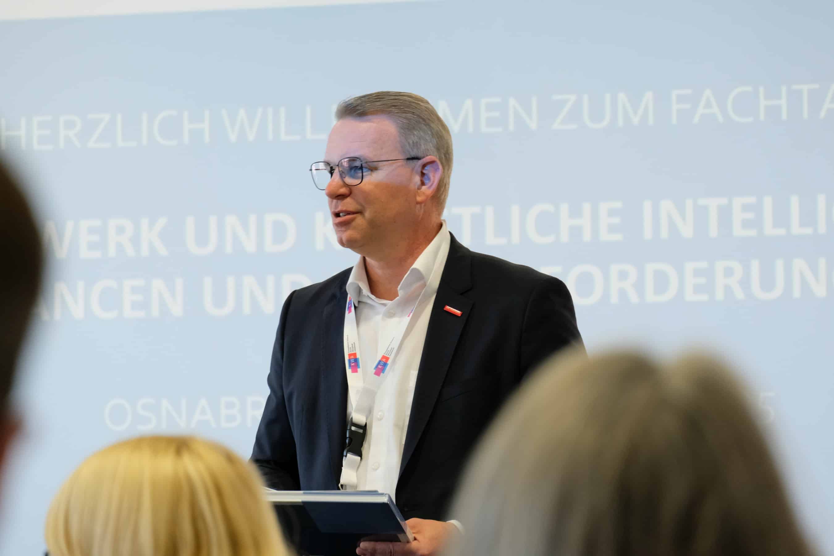 Bereits am Freitagmittag begrüßten Regionalbischof Friedrich Selter, theologischer Vorsitzender der Arbeitsgemeinschaft Handwerk und Kirche und Regionalbischof im Sprengel Osnabrück, und Sven Ruschhaupt, Hauptgeschäftsführer der Handwerkskammer Osnabrück-Emsland-Grafschaft Bentheim, die Teilnehmenden im InnovationsCentrum Osnabrück.Der Fachtag startete mit einem Impulsvortrag von Prof. Dr. Joachim Hertzberg, der mit seinem Beitrag „Nicht alles stimmt, was geschrieben steht“ zentrale Fragen zur Zuverlässigkeit und Verantwortung von Künstlicher Intelligenz aufwarf.