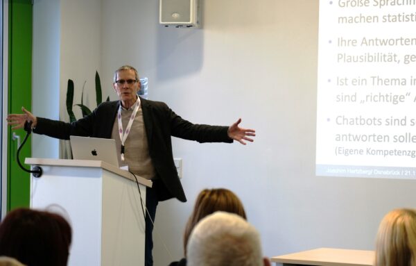 Im zweiten Schwerpunkt betonte Hertzberg, dass KI längst eine Basistechnologie im Alltag geworden ist – von Empfehlungssystemen bis zur Spracherkennung – und zunehmend auch in Unternehmen Einsatz findet, etwa im Kundenkontakt- oder Wissensmanagement. Gleichzeitig zeigte er die Grenzen großer Sprachmodelle auf: Sie liefern statistische Wahrscheinlichkeiten statt Wahrheiten und spiegeln nur das wider, was im Training ausreichend vertreten war.