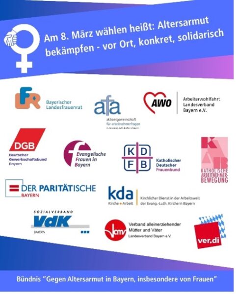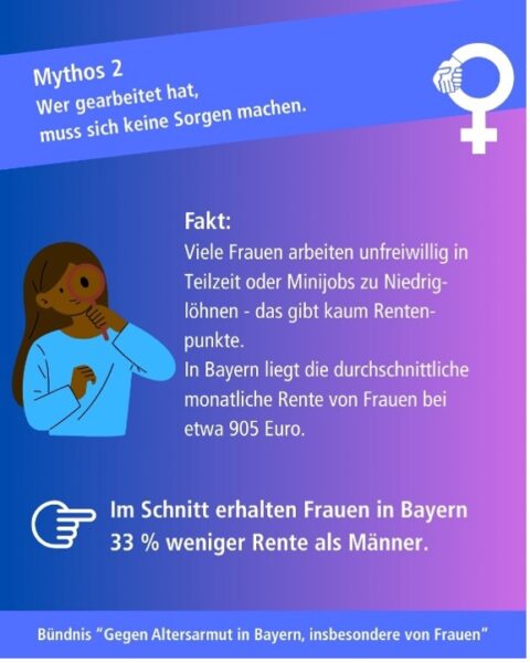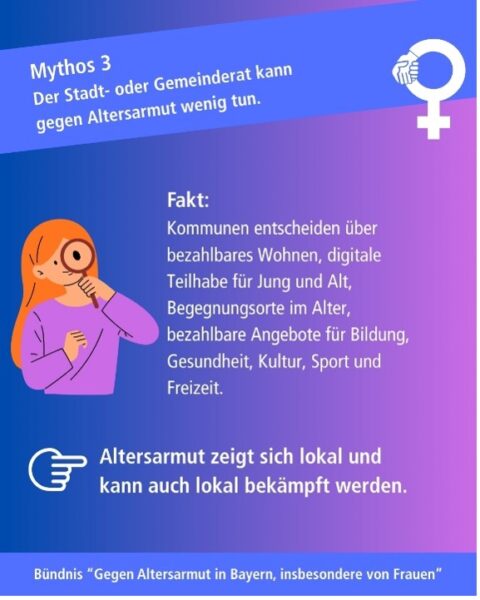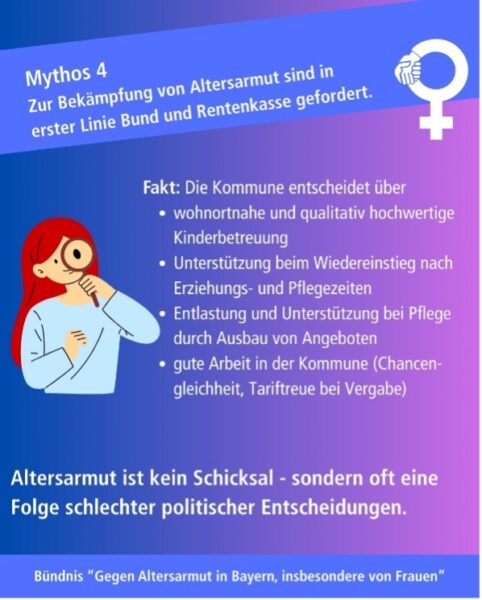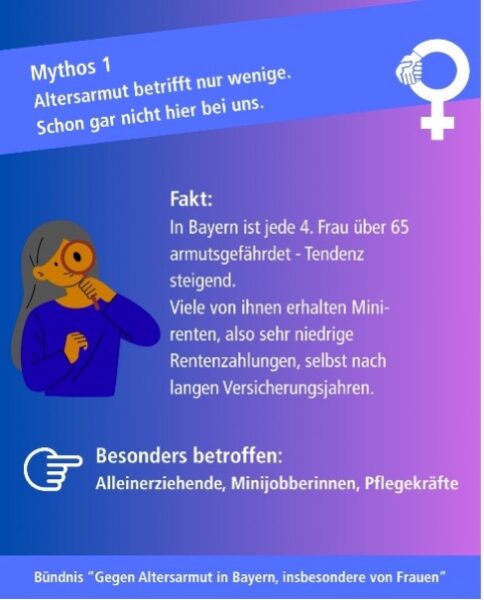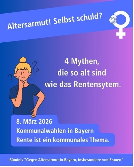 Das „Bündnis gegen Altersarmut insbesondere von Frauen“ in Bayern sagt dazu: Es ist Zeit, veraltete Mythen zu hinterfragen und politische Verantwortung zu übernehmen, um Altersarmut wirksam zu bekämpfen. Denn Rente und soziale Absicherung sind auch kommunale Themen!